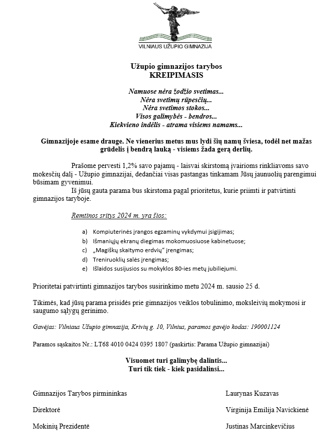 Gavėjas: Vilniaus Užupio gimnazija, Krivių g. 10, Vilnius, paramos gavėjo kodas: 190001124 Paramos sąskaitos Nr.: LT68 4010 0424 0395 1807 (paskirtis: Parama Užupio gimnazijai)